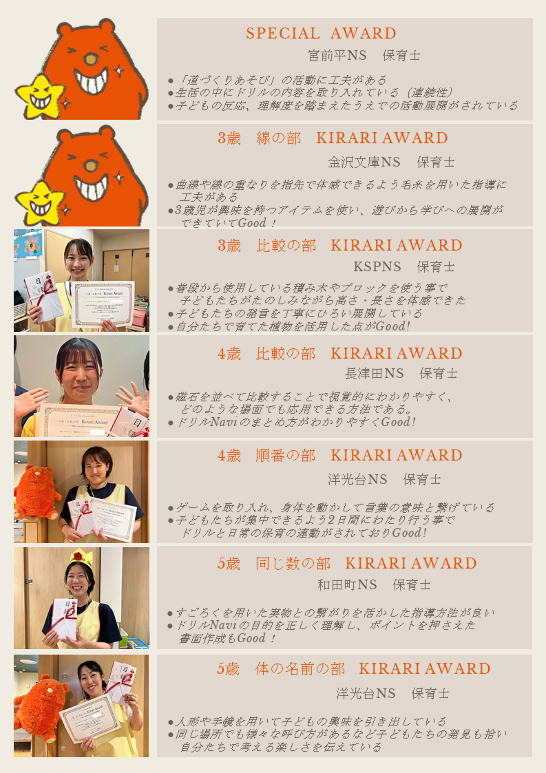 各園の実践例の共有によりスターチャイルド全体の指導力・保育の質向上、指導の均一化を目指し、社員にとって「やりがい」「働きがい」の一つとなることを目的として、オリジナル教材「あそ*し*あそドリル」の活用法を社内共有し、大賞を決定する第5回「あそ*し*あそドリルNavi Award」を開催いたしました。